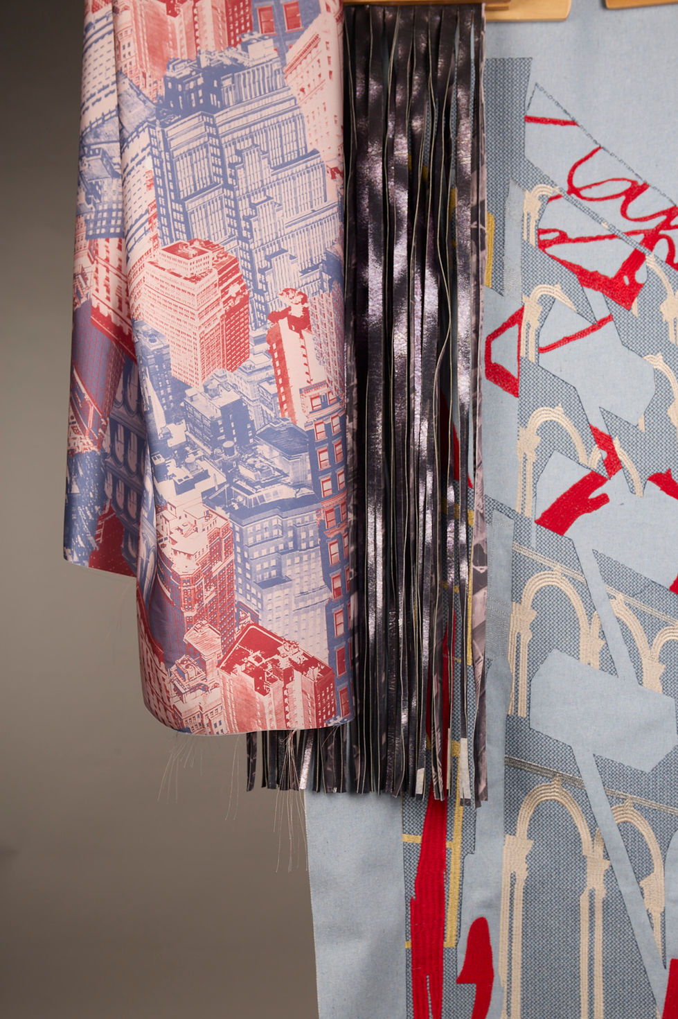 Urban textures, geometric forms, and structural patterns are translated into textiles through digital print, laser cutting, and fabric manipulation. I focused on developing tactile qualities, using print to capture layered city motifs, manipulation to build depth, and the laser cutter to create precision patterns and negative space. Together, these techniques push surface design into a more dynamic, three-dimensional form.